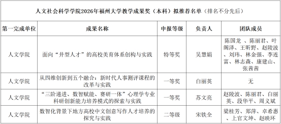 经教师自主申报,学院党委会会议、党政联席会议研究决定,拟推荐以下4个项目申报2026年国产a片 教学成果奖(本科),其中1项申报特等奖,2项申报一等奖,1项申报二等奖,现予以公示。
